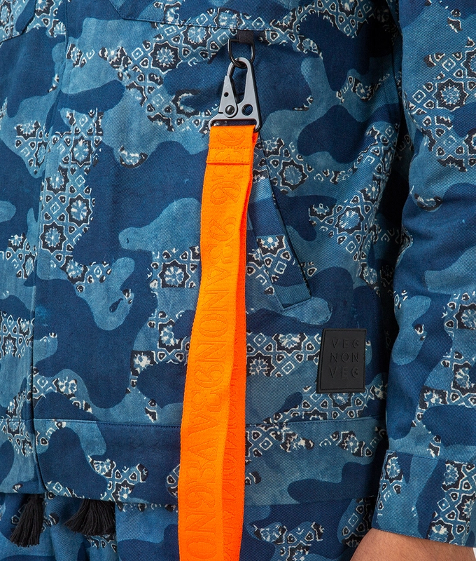 Our unique VegNonVeg Camo motif taps into our Indian roots and pays homage to our rich textile heritage. This concept uses a traditional method of Ajrakh block printing and resist dyeing to create our signature camo. This collision of traditional craft with an unconventional application on contemporary silhouettes speaks to us being a streetwear brand from India ��� connected to our roots, relevant in the now, but creating the future.
