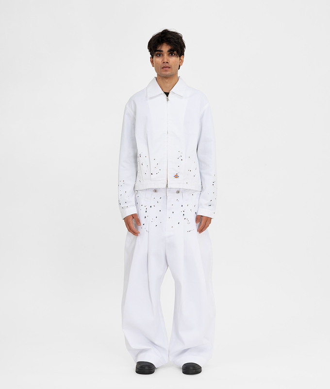 BAGGY in collaboration with DICKIES. The deep two-tuck design and long middle seam give the waist a clean look while creating a bold, wide silhouette. The waist has buttons, which can be fastened to the buttonholes of the EISENHOWER JK WITH DICKIES to wear it like a jumpsuit. The waist tucks are set in a position that connects with the tucks of the EISENHOWER JK WITH DICKIES when the buttons are fastened. A patch of a blurred painting is sewn onto the back of the EISENHOWER JK WITH DICKIES, and the waist is painted based on the story that paint splattered while the painting was being done. The fabric is Dickies' standard T/C twill, and the silhouette is emphasized when it is still stiff before washing.