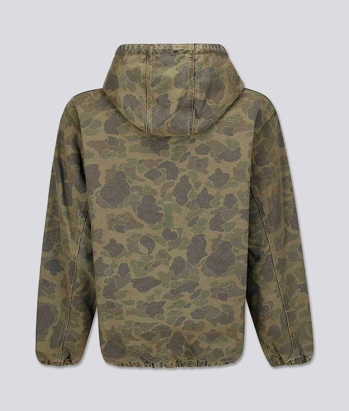 The Duck Active Jacket is made from heavyweight Dearborn Canvas, featuring an allover camouflage print. The item has also been garment-dyed for a softer feel and complex color configuration. The jacket is lined with poplin in the body and nylon in the sleeves, while a rib-knit bottom band and cuffs create a cinching effect. Triple stitching, an adjustable hood, and a zipped front fastening provide functional detailing. A woven Square Label appears on the front.
