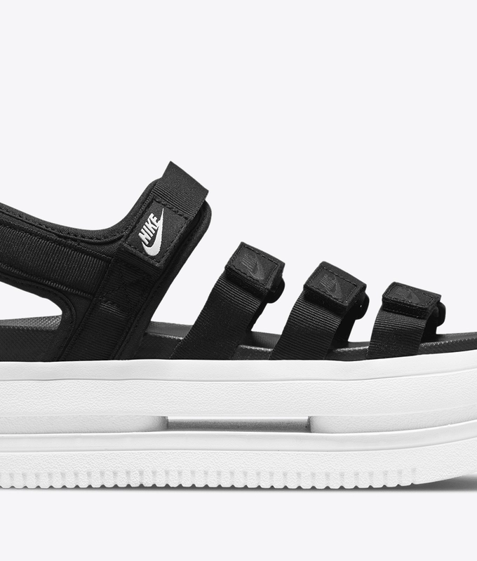 Lifted. Classic hoops detailing. Strappy but easy to wear. Check all the boxes in the Nike Icon Classic. Its big, bold midsole wows with comfort. The outsole pattern delivers iconic Air Force 1 vibes, whjle the multiple hook-and-loop straps add a fearless look. Get ready to shine with this new voice in sandal style.