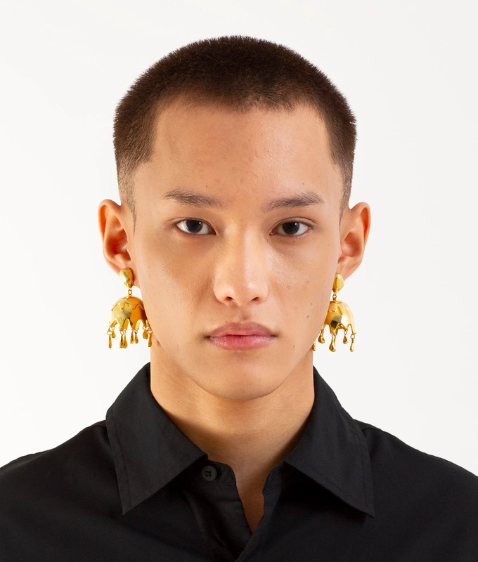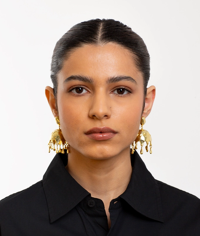 VegNonVeg’s first-ever jewellery collection stays true to our Indian roots. With an overarching whimsical aesthetic, juxtaposition takes centre stage as we continue to explore the bridge between what is traditional and what is contemporary. For instance, we’ve taken the classic Jhumka and given it a more liquid, molten form to make a piece you could wear every day — with Indianwear or streetwear. Other pieces include an ear cuff, molten metal hoops and a line of essential hoops that are a must-have. Our jewellery is made of brass and finished with silver and gold plating.