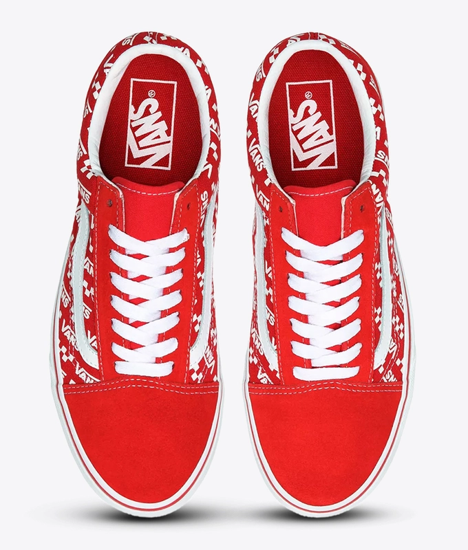 The Logo Repeat Old Skool, the Vans classic skate shoe and first to bare the iconic sidestripe, is a low top lace-up featuring printed canvas and suede uppers, re-enforced toecaps to withstand repeated wear, padded collars for support and flexibility, and signature rubber waffle outsoles.
