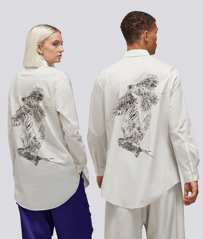 The Y-3 Graphic Shirt is understated on front and features a vivid nature-inspired graphic on the back. Birds soar across the cotton and nylon blend plain weave fabric with built-in stretch, offering a glimpse into the ultraviolet colour spectrum human eyes can't see. A fold-down collar and buttons add classic touches.
